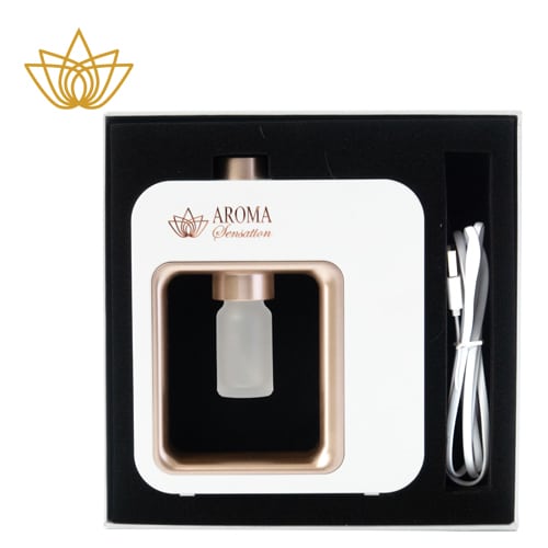 1 Aromatherapie Diffusor SIENA in Wit met roségoud accenten incl.. 1x10ml Flesje om zelf bij te kunnen vullen, 1x USB Kabel, 1x Handleiding. Mooie exclusieve verpakking.